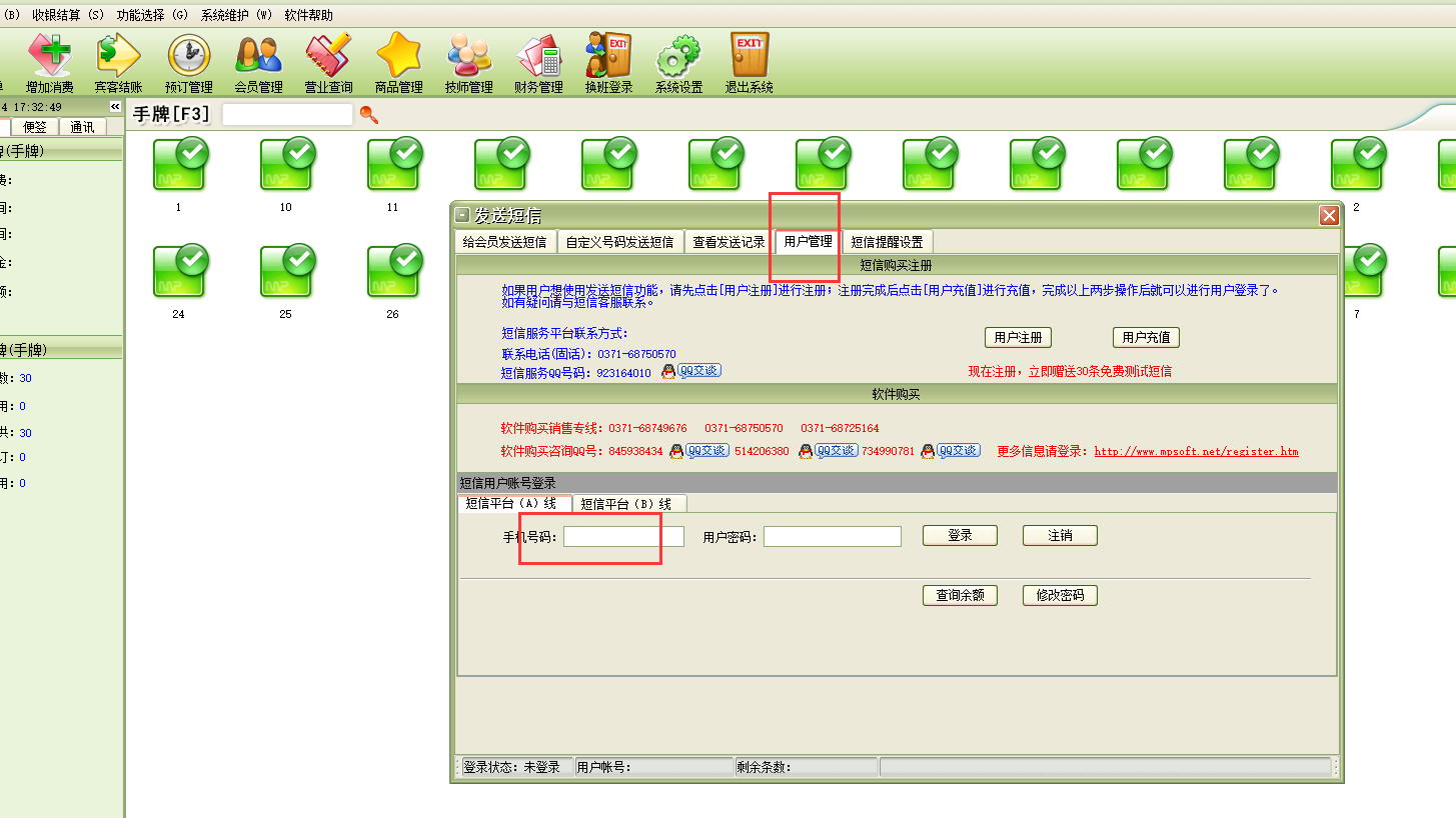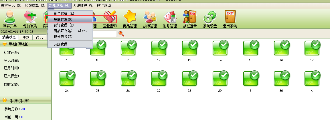 美萍足浴软件,如何使用短信功能?短信群发,短信帐号查询,短信设置,短信充值