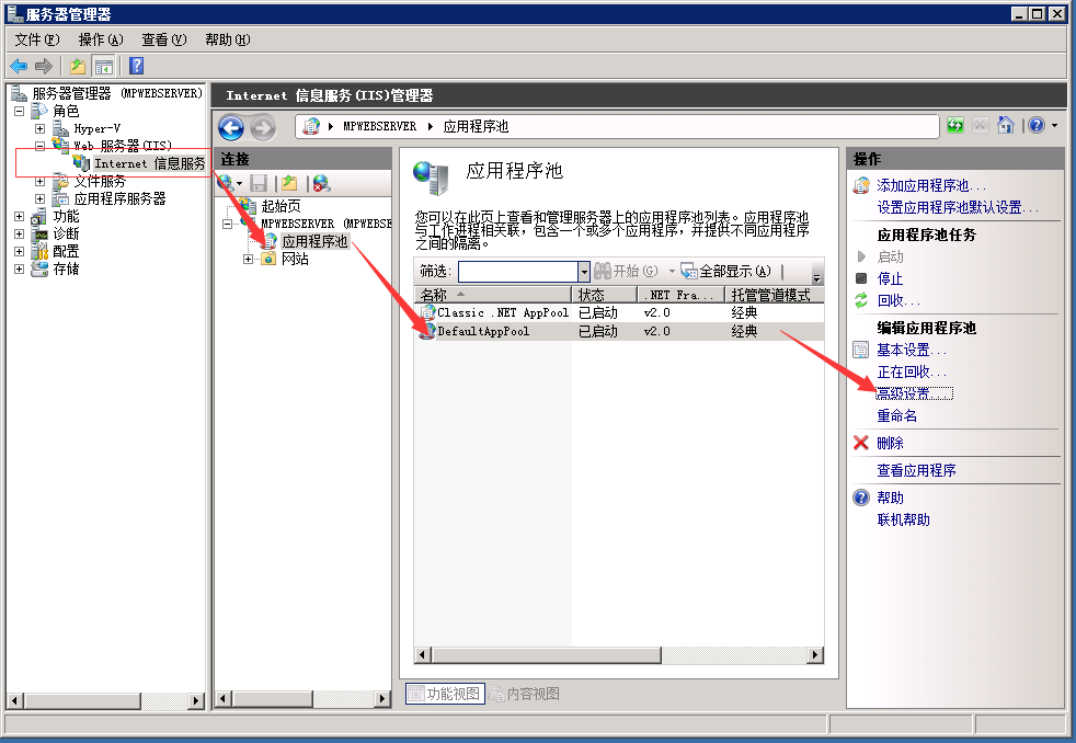 完面上面的配置后IIS就安装完毕,然后如下图打开IIS对应用程序池进行简单的设置,环境就搭建完毕。