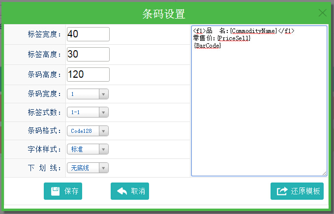 “系统设置-打印设置”,可以设置条码的大小以及条码要打印的文字信息等