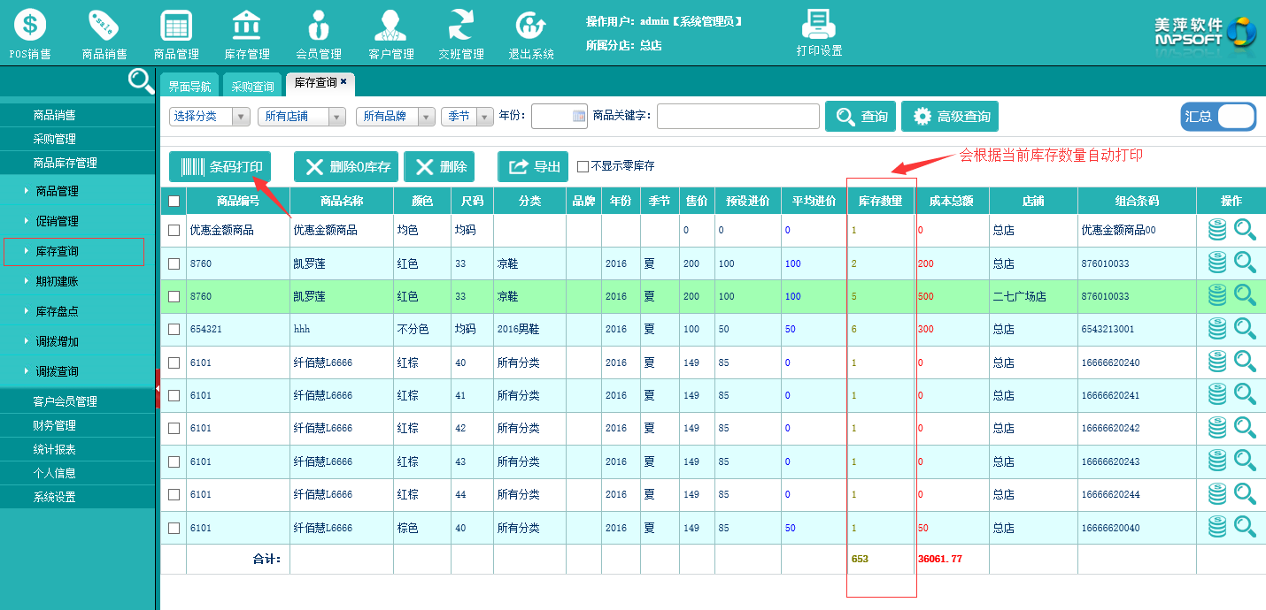 “商品库存管理-库存查询” 和 “采购管理-采购查询” 中可以批量打印条码。