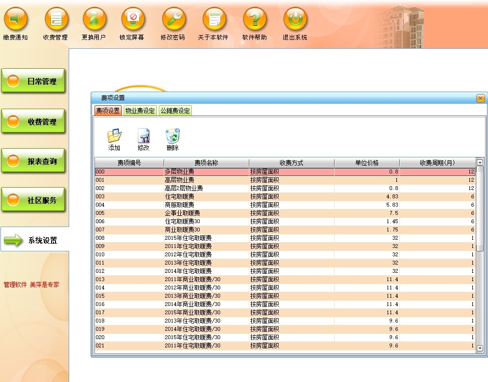 第二:物业软件费项设置:1、费项设置分为基本物业费和仪表类物业费两大类,各自又可定义多种不同的费项。基本物业费主要是定义那些按户或按房屋面积收取的费用,如:卫生费、治安费等;仪表类物业费主要是按表的走量需要计算的那些费用,如:水费、电费等,它可设置定额价和超额价。2、对于仪表类物业费又可分为自用表和公摊表两大类,并在此项设置中为每户分配仪表编号,并为住户分配要分摊的公摊表。