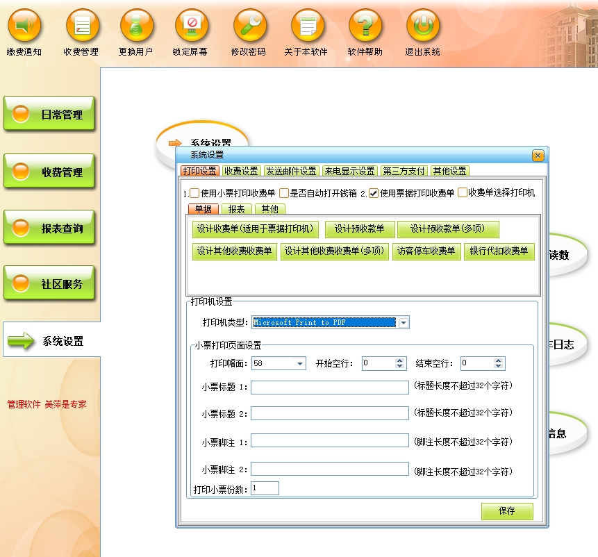 第五:物业软件设置打印收费单据的打印机和缴费通知单的打印格式,在此可对缴费通知单进行个性化定义,可以设置收费单据的打印幅面和单据上要打印的信息。
