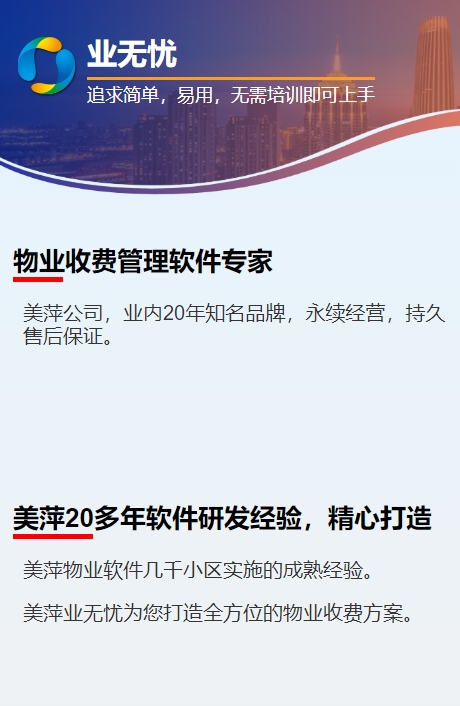 第十二:业无忧软件为各类型物业公司量身定制,使繁锁的业务管理变得方便明晰,有效提高工作效率。