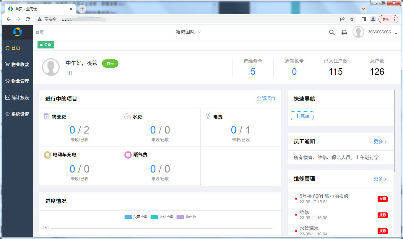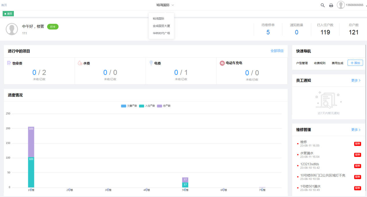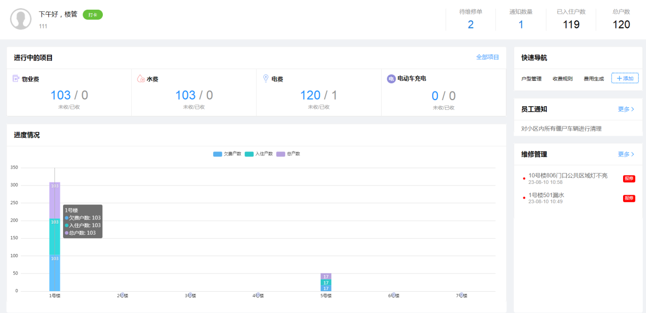 第一:业无忧软件电脑官网首页看板(可自定义显示费项,根据楼管账号,显示分管楼栋)。