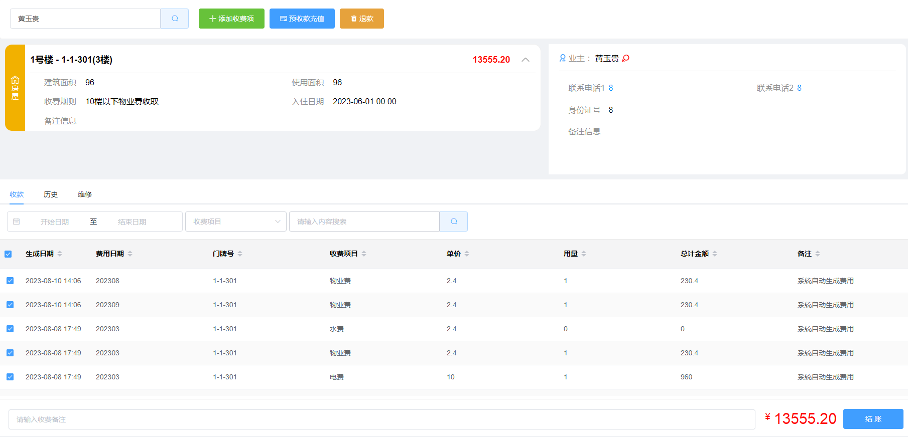 第四:业无忧软件的物业收款(可根据门牌号、业主姓名、手机号快速查找到业主下的所有房屋及欠费信息)。
