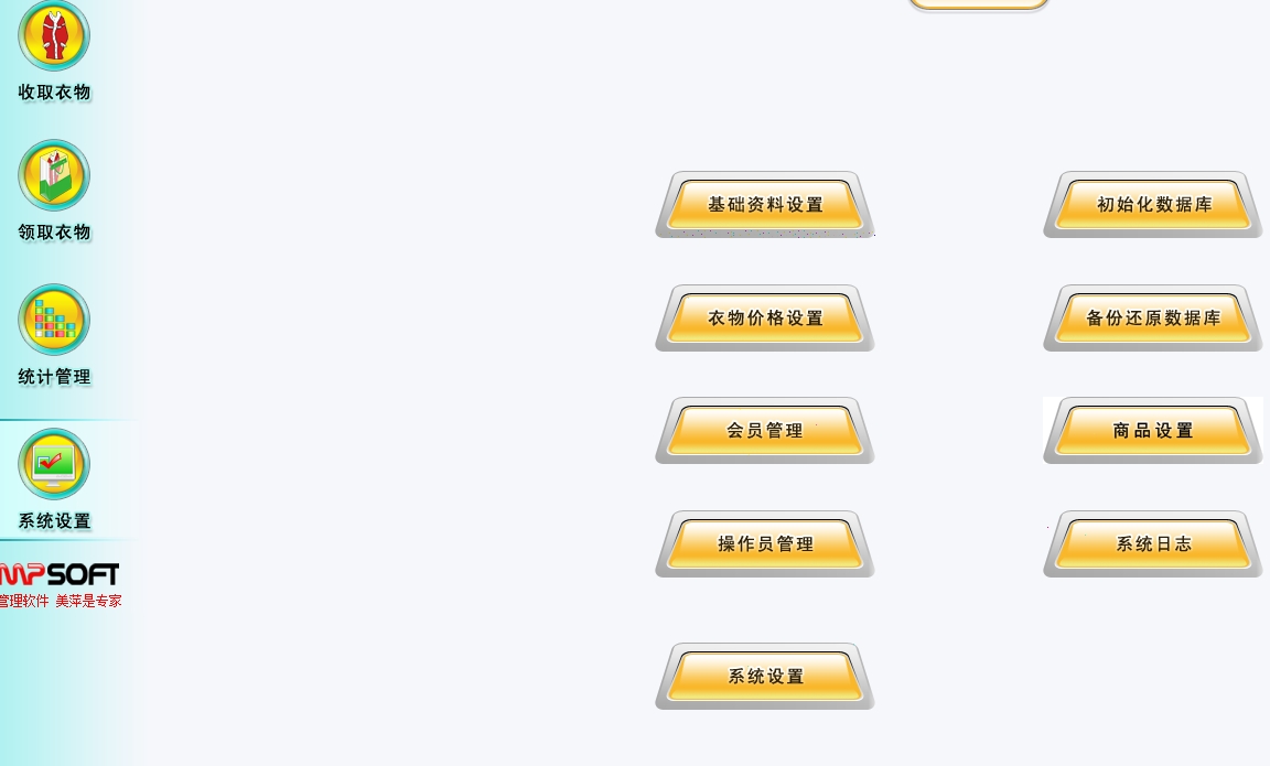 第四:干洗店(洗衣店)软件系统设置,包括有:备份恢复数据库、操作员设置、其它设置。
