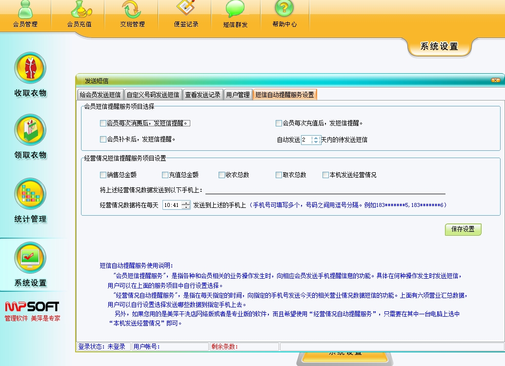 第十二:干洗店(洗衣店)软件可以自动给当天过生日的会员发送生日祝福短消息,过年过节给会员发送节日祝福短消息,以及给需要提醒的会员发送提醒短消息。
