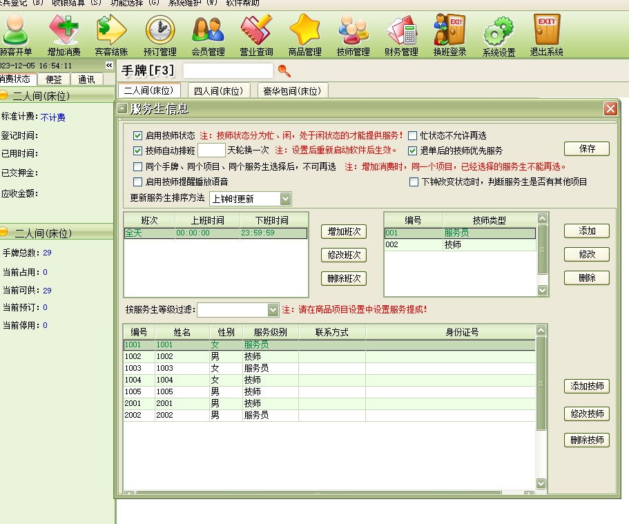 第九:足疗软件可为员工分配相应的角色(可操作的权限),相应的操作员登录本系统时只能对属于自己权限范围内的功能进行操作。做到管理工作的安全顺利的进行。