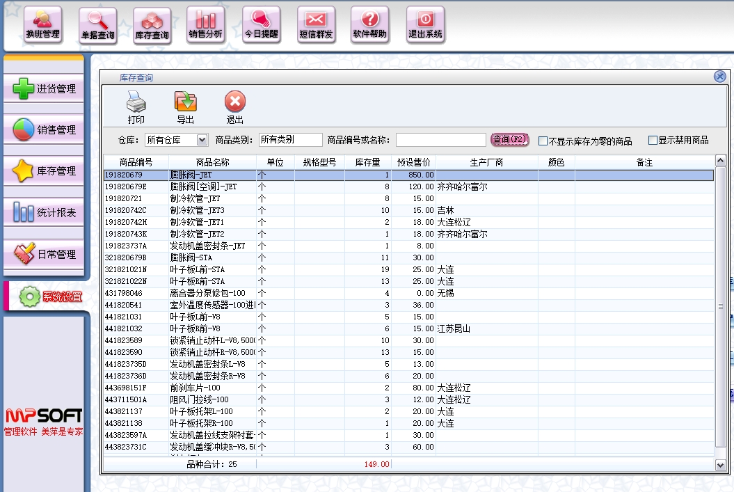 美萍汽车配件(汽配)进销存管理系统的主要亮点包括: