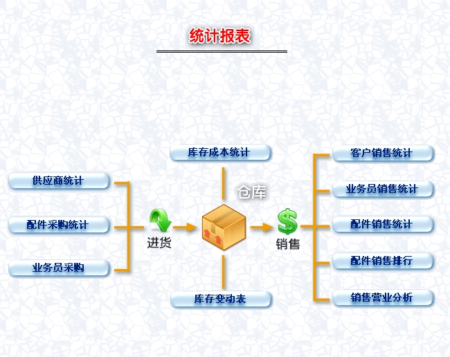 第七:汽车配件(汽配)进销存软件独创关联数据模式,让所有查询都简单方便,提供强大统计报表对配件业务成本利润轻松掌握。