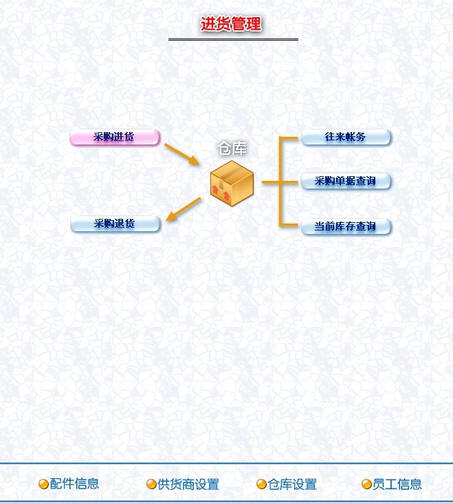 第八:汽车配件(汽配)进销存软件支持采购/退货提供多种价格计算模式,使繁锁的业务管理变得方便明晰,有效提高工作效率。