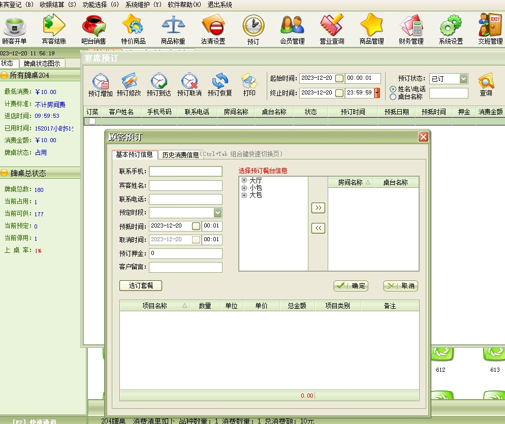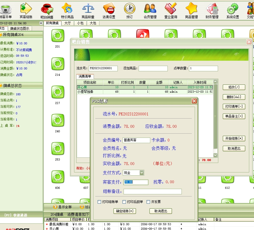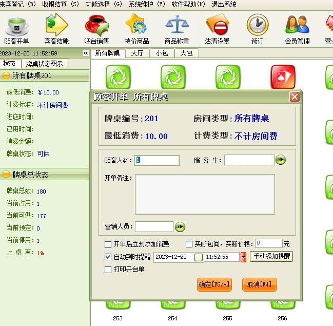第十四:棋牌室软件支持来宾登记→顾客开单:每个客户发生消费前必须进行登记(建立客户帐),给客户安排一个房间(牌桌)等房间项目,房间项目必须是在“系统设置”模块中的“房间项目”中已经设置,系统只能对已设置的房间项目(牌桌)进行登记。