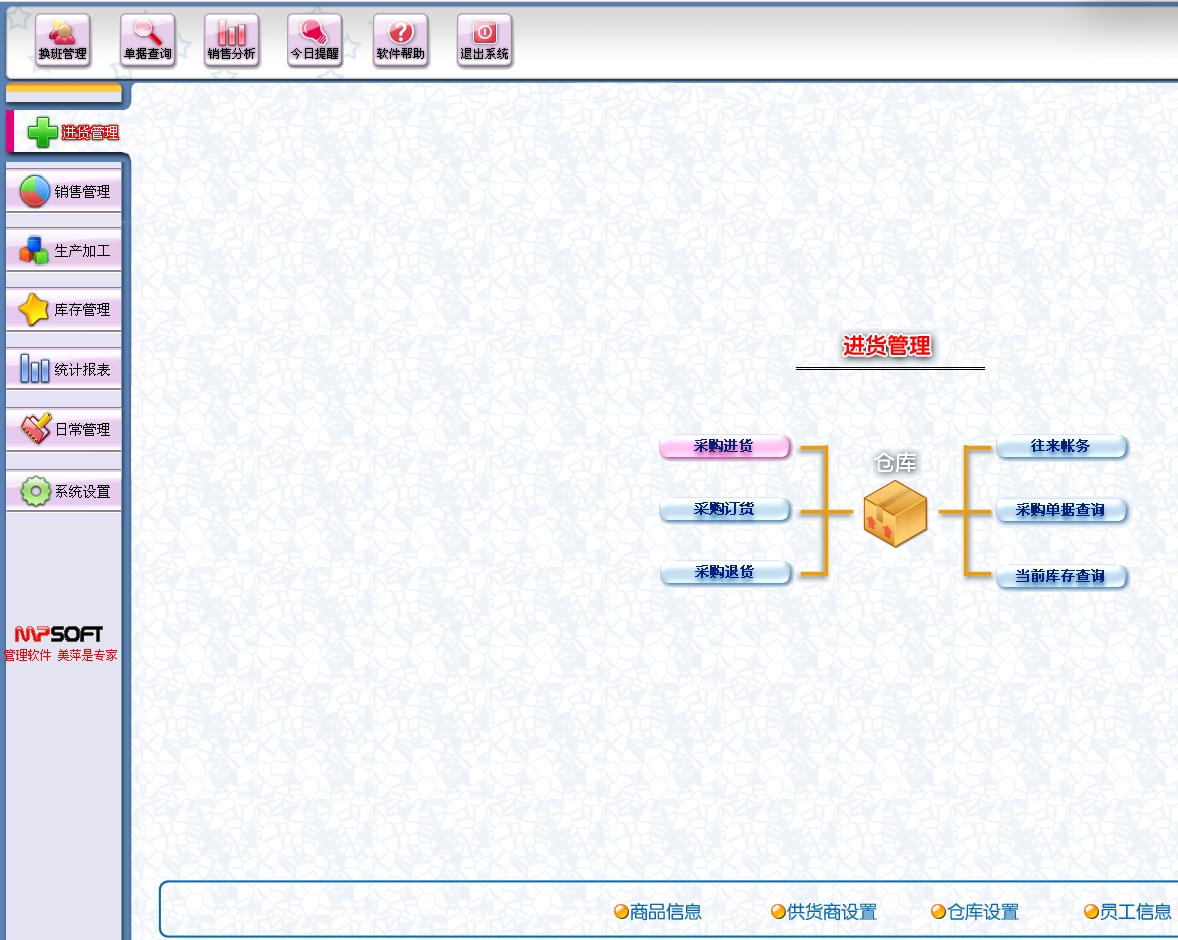 第2套:美萍商业进销存管理系统:适合于从事商品流通行业,需要管理进货、销售、库存、财务等往来业务的商业企业使用。(详询在线客服,给您发最新版本)