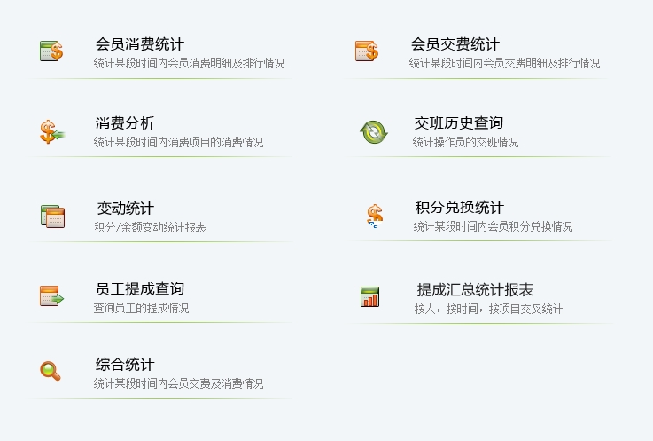 第十三:美容院(新版美容院)软件提供会员消费统计,充值统计和分店营业统计等功能。
