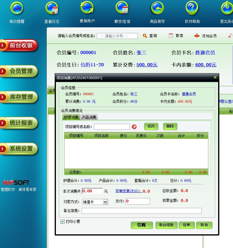 第一:美容院(新版美容院)软件会员消费:包括护理、产品、套餐三种,均可选择美容师、床位,支持各种结账方式。