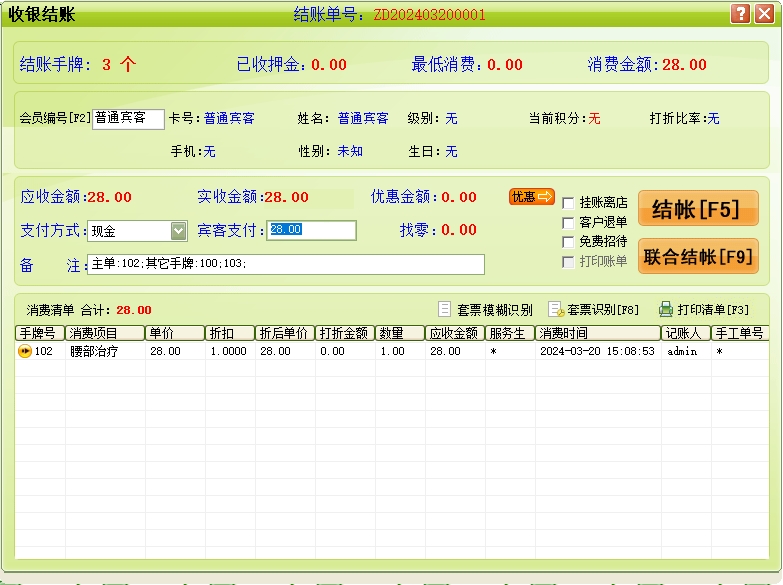 第十三:保健按摩软件支持对帐单进行会员打折、全场打折、任意打折、单项特殊打折设置等多种打折方式。