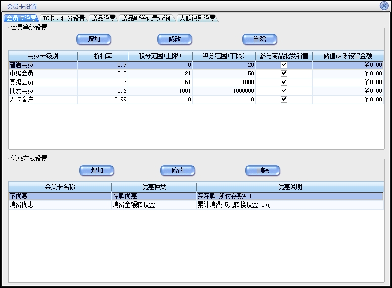 第四:会员销售软件支持会员管理,会员可分为折扣卡和储值卡,会员卡可以使用条码卡、磁条卡、ID卡,可以根据自己的需要设置不同的优惠方式,灵活简单。