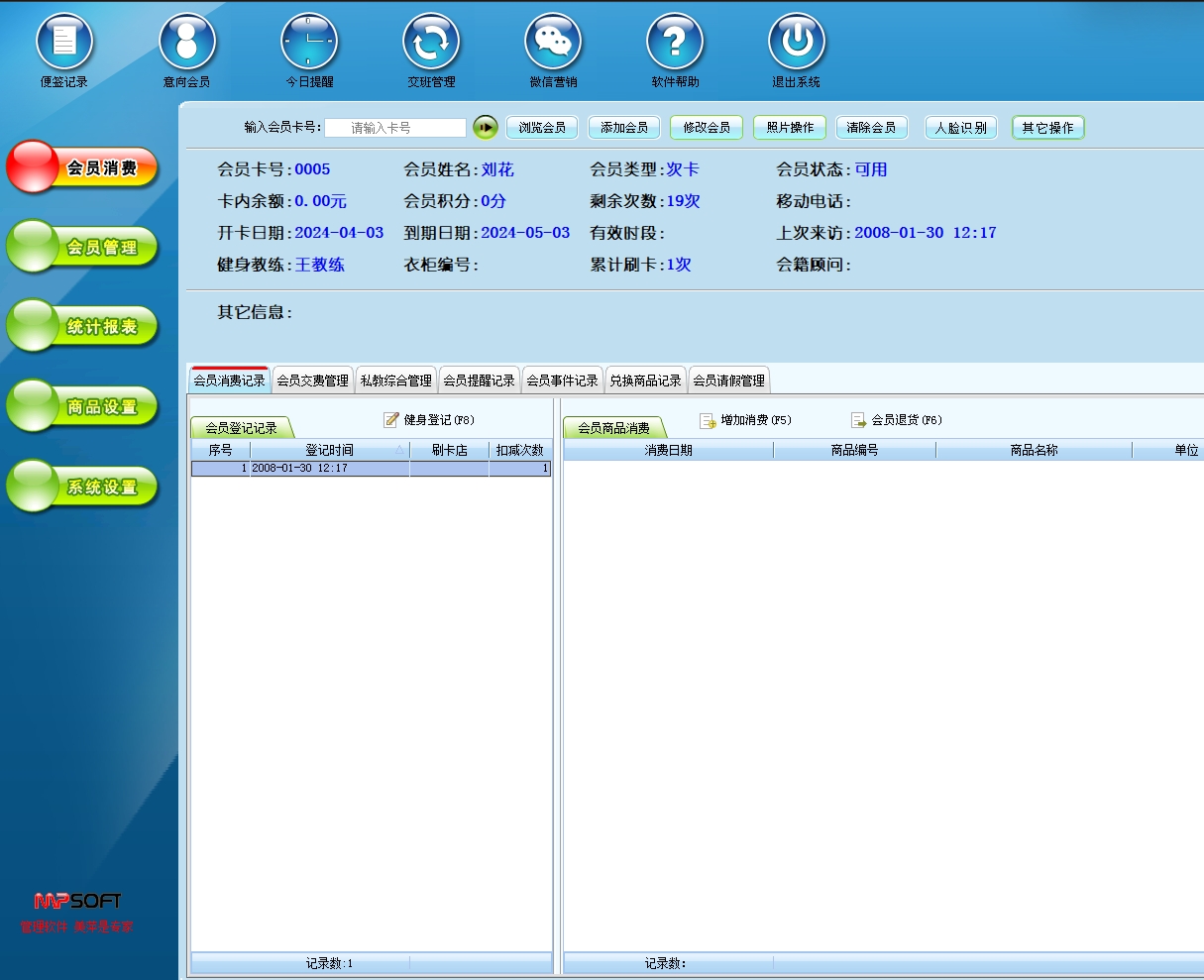 第四步: 进入“会员消费”,可以对会员进行刷卡登记或消费商品。