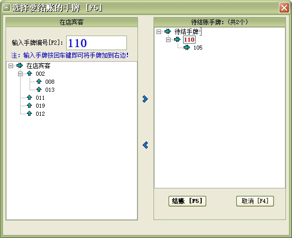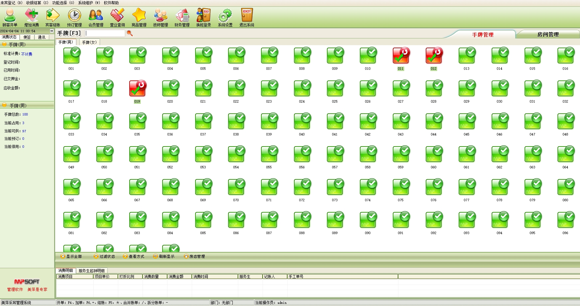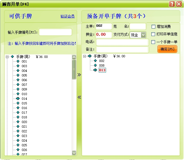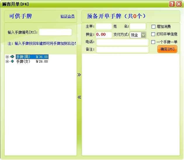 手牌:手牌可分为男宾手牌和女宾手牌,每个手牌就具体到某一来店登记的宾客,一般把手牌提供给一个客人后,在当前客人未退出占用状态前暂时无法提供给另一个客人消费。此项目在系统设置中设置,在宾客开单时使用。
