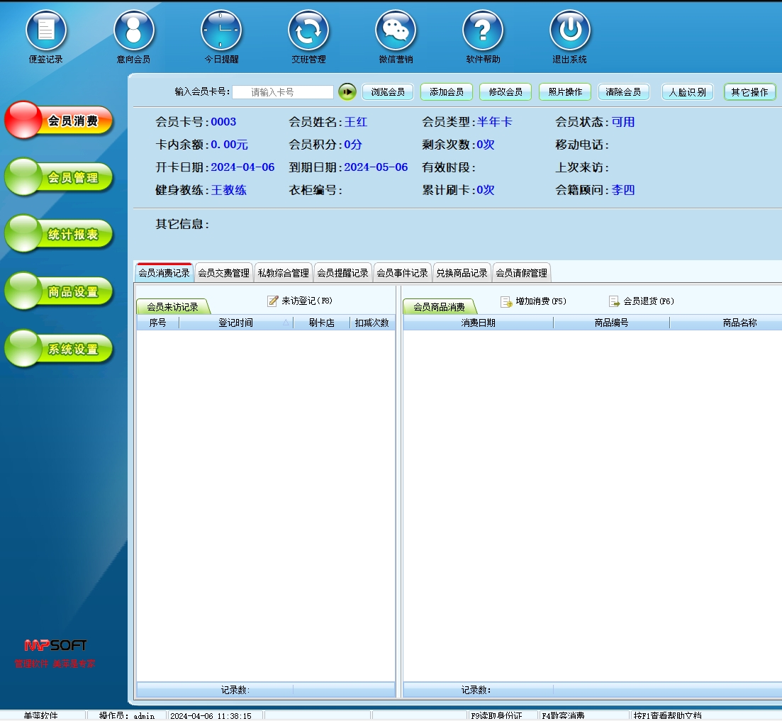 第四步: 进入“会员消费”,可以对会员进行刷卡登记或消费商品。
